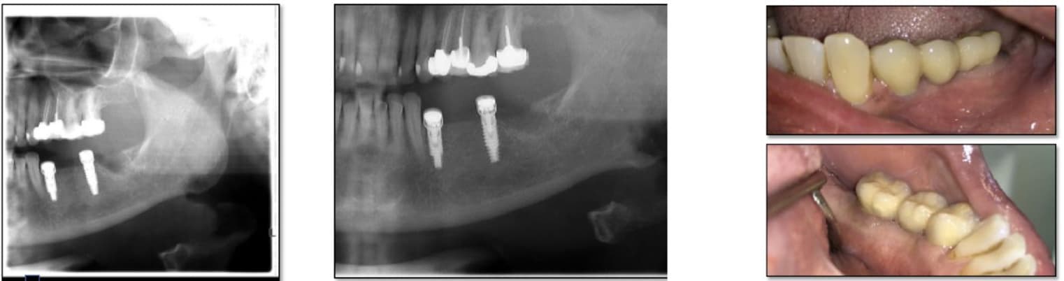 • At 24 months, the regenerated bone remained stable, with a 3.7 mm gain in bone height, healthy peri-implant soft tissue, and no recurrence of inflammation or pocketing.