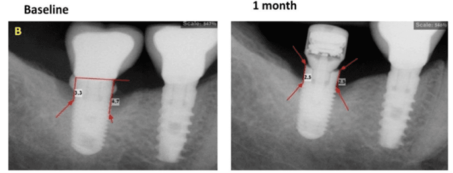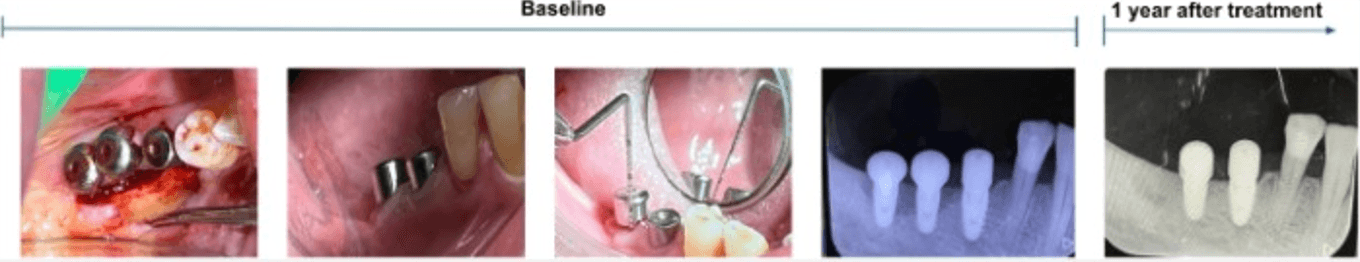 • At 1 year, clinical measurements revealed a reduction of pocket depth from 6 mm to 2 mm—representing a 200% improvement in clinical attachment level and return to healthy peri-implant conditions.